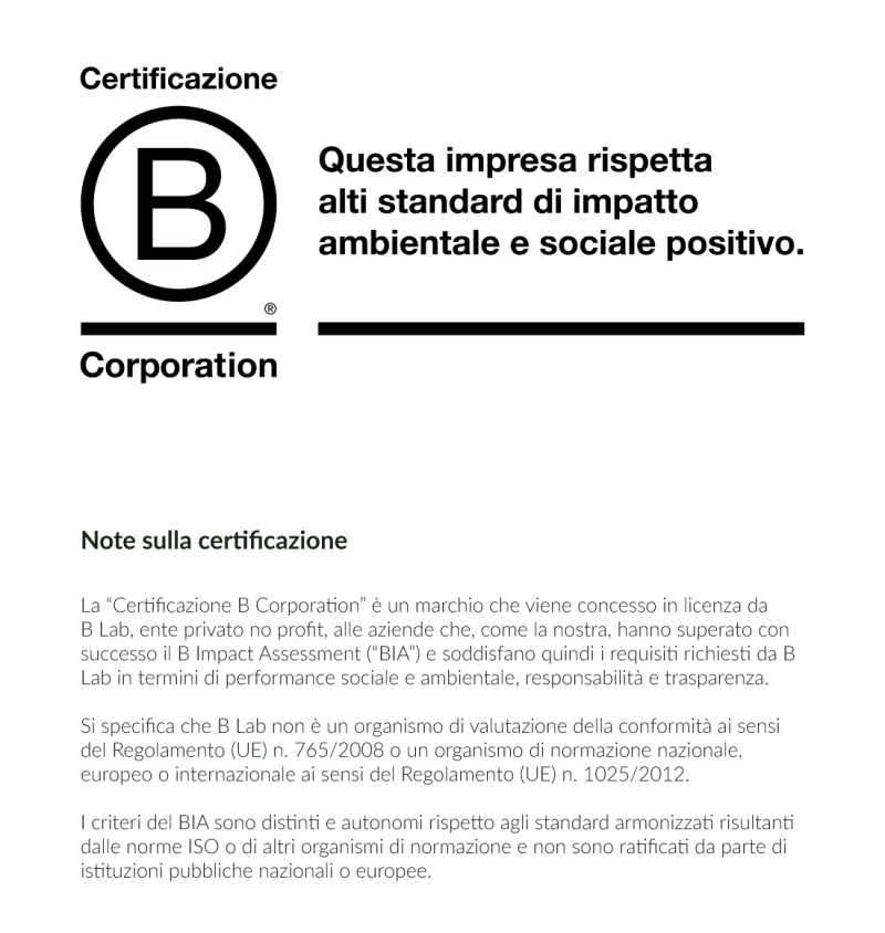La “Certificazione B Corporation” è un marchio che viene concesso in licenza da B Lab, ente privato no profit, alle aziende che, come la nostra, hanno superato con successo il B Impact Assessment (“BIA”) e soddisfano quindi i requisiti richiesti da B Lab in termini di performance sociale e ambientale, responsabilità e trasparenza. Si specifica che B Lab non è un organismo di valutazione della conformità ai sensi del Regolamento (UE) n. 765/2008 o un organismo di normazione nazionale, europeo o internazionale ai sensi del Regolamento (UE) n. 1025/2012. I criteri del BIA sono distinti e autonomi rispetto agli standard armonizzati risultanti dalle norme ISO o di altri organismi di normazione e non sono ratificati da parte di istituzioni pubbliche nazionali o europee.